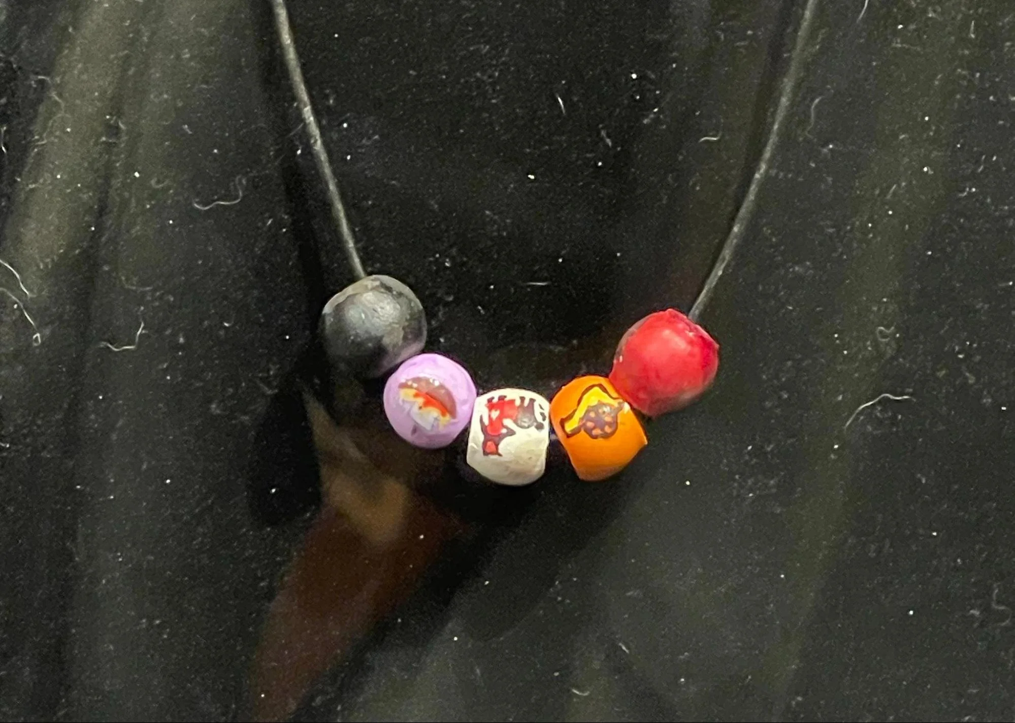 As of most recent appearances, Annabeth’s necklace includes six beads and her father’s class ring. The newest bead, from Percy’s first year at Camp, is a teal blue with a trident.
