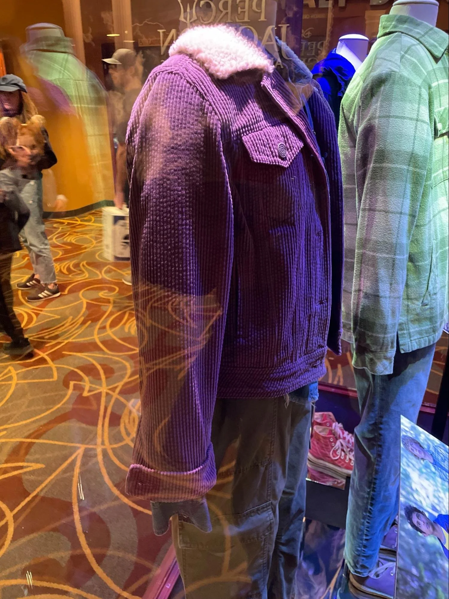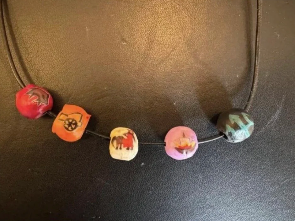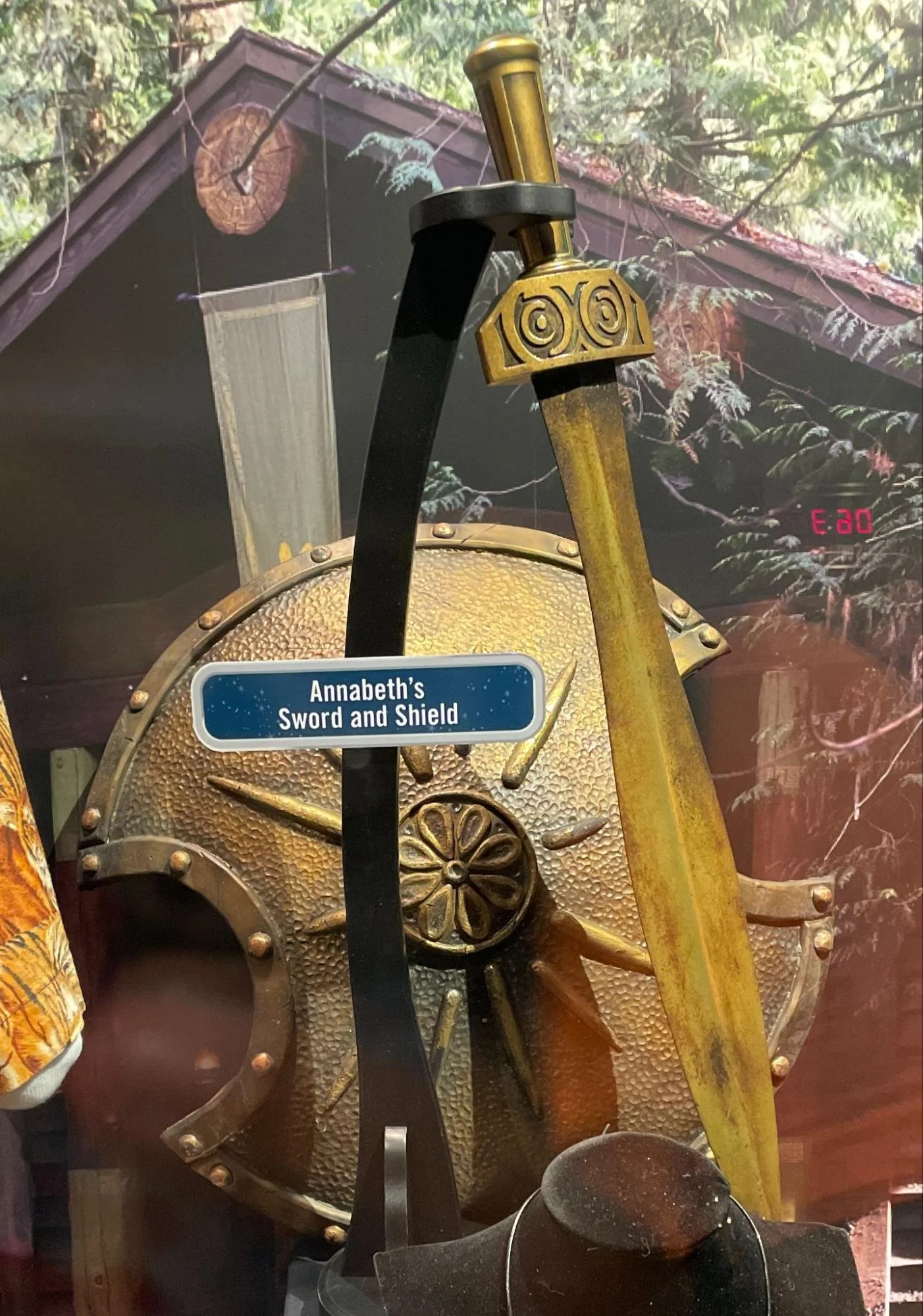 Morgan’s guide above details Annabeth’s canon beads that she receives on her necklace throughout the books, and this same order of items should apply in the show. Photographed here is an example of one of the actual prop necklaces worn in the show: the (I assume) Pine Tree, Centaur in a prom dress, and the Greek trireme from the book are clearly pictured, along with a Chariot and a mystery bead. Even in my close-up photos I took myself of the exhibit, I couldn’t decipher the fifth bead’s design, and it is never discussed in the books or the show. So…get creative!